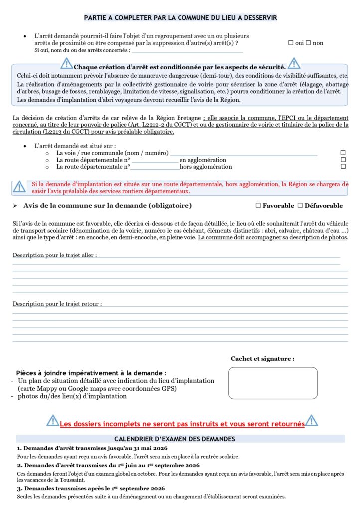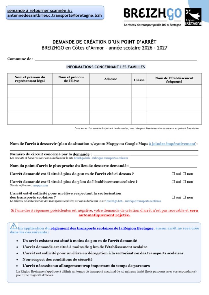 Nous vous prions de bien vouloir trouver ci-joint le formulaire de demande de création de point d’arrêt pour l’année scolaire 2026 – 2027. Le formulaire doit être complété et déposé en mairie avant le 27 mai 2026.